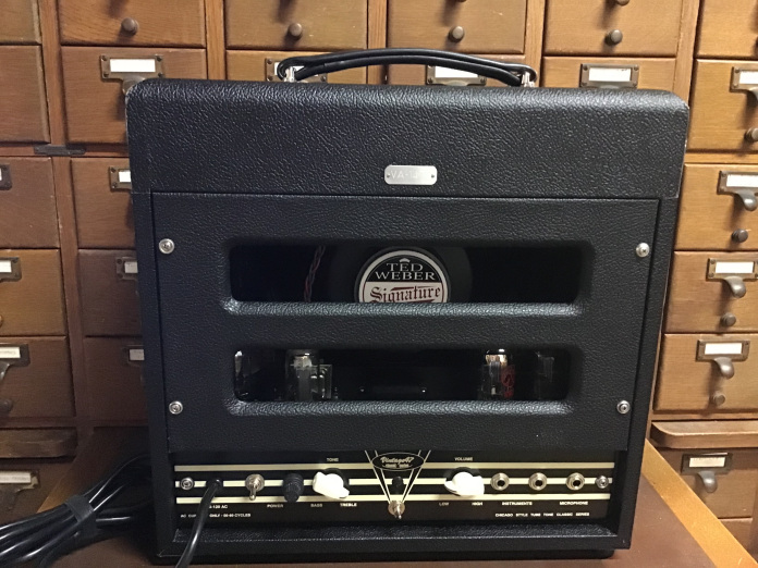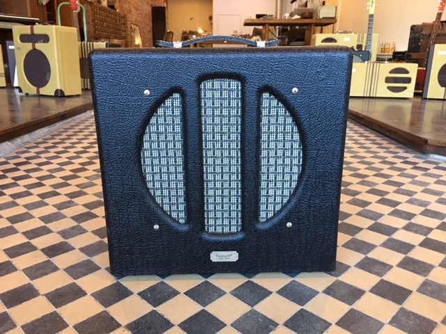 The Rickenbacker inspired cabinet design boasts the all octal tube Valco Supreme 12 watt class AB push pull ciruit. The speaker is a 12 inch Ted Weber Signature. The finger jointed baltic birch cabinet is covered in black tolex.