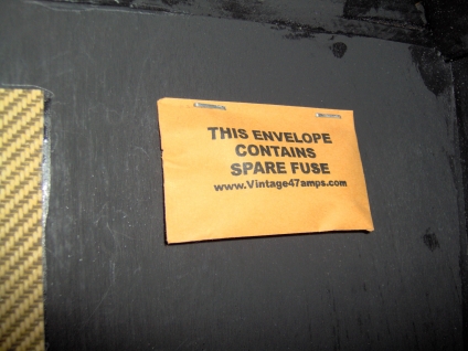 Note that the spare fuse envelope (including the fuse) is affixed inside the back of cabinet - a very overlooked Valco Style detail! Reproduction cabs are always "Bench Tested Plug and Play Ready". Every amp/cabinet combo includes a serial number registered to the new owner.