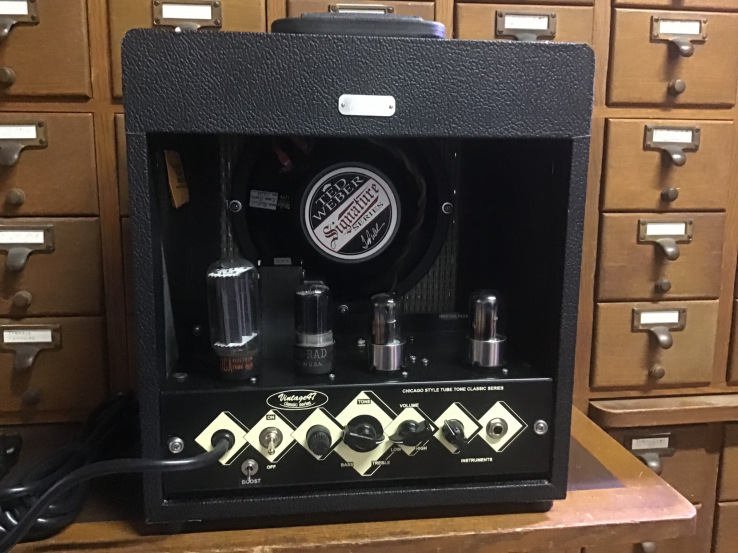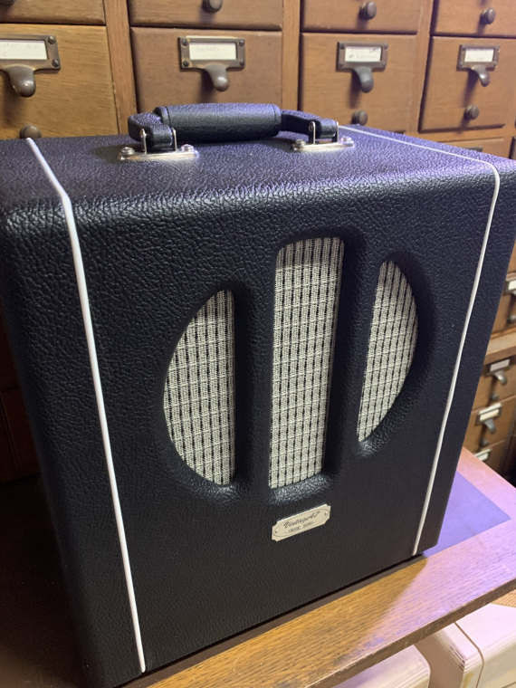Don't let the small size fool you. This little thing is a tone monster. 5 class A watts of fat Valco sound through A Ted Wever Signature 8" ceramic speaker is a great practice / recording amp that can take you where ever you need to go. Covered in black tolex with inlaid beading for that vintage look and feel. Absoulutely the loudest of our class A offerings. Loud enough that we added a super effective master volume to get that breakup at bedroom levels.