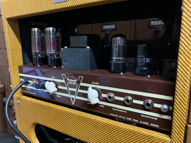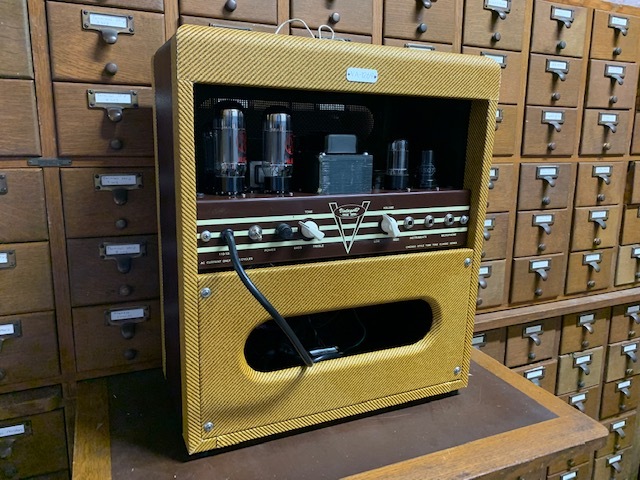 The VA-20 is the amp "formally known as the Twin", but sporting a 12" speaker instead of the pair of oval speakers. An amp designed for the gigging player, it has the volume to keep up as well as cut through the rest of the band with a bit more clean headroom, all while maintaining that signature Vintage 47 / Valco Octal tube sound. In a word (or 2) Big & Fat! For those lighter fare gigs, or when you want the breakup without the volume, just flip the half power switch for earlier breakup at a lower volume. It is a loud amp, so the half power switch can be a welcomed addition. This delivers crisp highs to booming lows and everything in between. All hand wired octal tube circuitry. Aged lacquered tweed with tolex circling the cabinet, separated with beading, covers our finger joined baltic birch cabinet. An incredibly versitile amp for both guitar and harp.